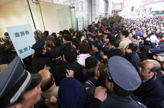 3月1日,杭州旅游消費券在上海啟動派發(fā)當(dāng)天,作為派發(fā)點之一的九江路杭州銀行上海分行排起了長龍。原定下午2時開始的派發(fā)活動吸引了不少市民。臨近中午,主辦方看到排隊市民已達(dá)千人,而且人數(shù)還在增加,擔(dān)心出“狀況”,決定把派發(fā)消費券的時間提前到下午1時。 到下午2時,人員仍源源不斷涌來,杭州旅游消費券卻將派發(fā)完畢。當(dāng)工作人員提醒申領(lǐng)者不必再排隊等候時,部分激動群眾強行沖擊側(cè)門,哄搶旅游消費券。原本秩序井然的隊伍頓時亂成一團,圍欄被推倒,有人被擠倒在地,手腳受傷。警方拉起警戒線后,主辦方于2時30宣布停止派發(fā)活動。一小時后重新向等候在銀行門口的群眾派發(fā)旅游消費券,半個小時內(nèi)發(fā)放完畢。 此前,江蘇常州在上海派發(fā)消費券時也發(fā)生了類似狀況。 然而,南京發(fā)放旅游消費券卻遭冷遇。不少獲得旅游消費券的市民不顧其不準(zhǔn)買賣的規(guī)定,將100元價值的旅游消費券在網(wǎng)上以50元甚至更低價格轉(zhuǎn)讓。 旅游消費券發(fā)放,為何遭遇“冷”“熱”兩重天?對此,網(wǎng)民各抒己見。網(wǎng)友KA抱怨說,旅游券發(fā)放不夠“實惠”,噱頭大于實際意義!半m然旅游券可以每40元抵用10元,但出門旅行各項花費遠(yuǎn)遠(yuǎn)超過所得到的實惠”!奥糜蜗M券其實刺激不了消費,原因很簡單:在乎消費券那點小便宜的人沒什么消費能力,真正有消費能力的人不會去湊那個熱鬧!本W(wǎng)友euro2k認(rèn)為,消費券沒發(fā)到合適的人手中,結(jié)果是白費勁。