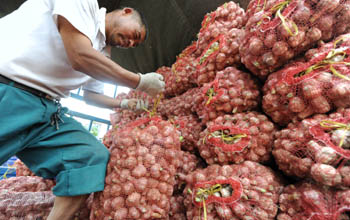 一名搬運工人正在河南省杞縣大蒜市場將蒜商收購的新蒜裝車運往山東。 繼去年大蒜市場借“甲流”“減產(chǎn)”等概念價格被炒高之后,“瘋狂的大蒜”今年在新蒜即將批量上市之際再次演出,“高價大蒜”引起了社會關注。記者在河南最大的優(yōu)質大蒜生產(chǎn)基地杞縣采訪時看到,冷庫大蒜每噸售價9000元左右,達到當?shù)厮鈨r的歷史高點。新華社記者 趙鵬 攝
