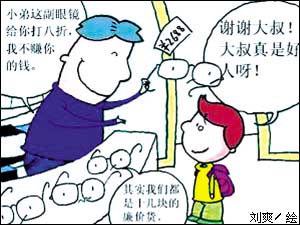 。玻霸溺R架,200元賣給你是講人情,300元賣給你是講交情,400元賣給你是行情!坨R業(yè)暴利順口溜。 一副眼鏡加價到底有多大?周樂正告訴記者,在目前的眼鏡經(jīng)營模式中,從眼鏡出廠到消費者終端,一副出廠價為22元的眼鏡通過傳統(tǒng)的經(jīng)銷渠道后,到消費者手里價格最高可達430元。 現(xiàn)任北京好宜買超視眼鏡連鎖有限公司總經(jīng)理的周樂正近日接受本報記者采訪,自曝眼鏡業(yè)潛規(guī)則。記者見到他時,他手腕上的刀痕還清晰可見。一年前,周樂正因創(chuàng)建平價眼鏡超市引進低價競爭而引來殺身之禍,被砍傷15刀。周樂正告訴記者,他家三代做眼鏡生意,目前他們家族在全國經(jīng)營著30多家眼鏡店。 一副眼鏡加價到底有多少?周樂正告訴記者,在目前的眼鏡經(jīng)營模式中,一副出廠價為22元的眼鏡通過傳統(tǒng)的經(jīng)銷渠道后,到消費者手里價格最高可達430元。