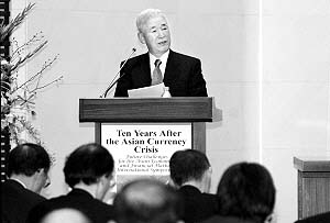 本報(bào)傳真圖 | 在亞洲金融危機(jī)爆發(fā)十周年之際,日本及東南亞各國(guó)央行行長(zhǎng)昨天齊聚東京,共同探討大量國(guó)際資本流入對(duì)地區(qū)貨幣政策和金融穩(wěn)定帶來(lái)的巨大沖擊。但與會(huì)的央行行長(zhǎng)們認(rèn)為,重現(xiàn)危機(jī)的可能性很小。