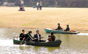 春天來了,游客在松江方塔公園內蕩起小舟。沈家善 攝