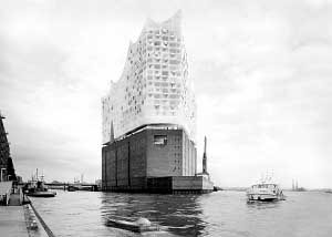 近了,越來越近了。我們乘坐的小船漸漸靠近碼頭。遠遠望去,紅褐色的外墻絲毫感受不到這座建筑的特殊,但手中新聞冊上的設計效果圖(見左圖)卻讓人陷入了無盡的遐想之中。 世人眼中,德國漢堡是一座港口城市。但如今,漢堡人要改變世人對它的印象。在易北河畔,漢堡人將建起一座宏偉的音樂廳——易北愛樂廳,它將躋身于世界十大音樂廳之列,給酷愛音樂的德國人再添一座如同柏林愛樂廳那樣的藝術殿堂。 “易北愛樂廳”