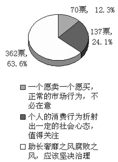 本報北京9月24日電 中秋前夕,高價月餅再次引起關(guān)注。9月17日,本報與人民網(wǎng)聯(lián)合推出“我們拿什么管住高價月餅”的網(wǎng)友調(diào)查,一周來反響熱烈。截至9月24日零時,共有8990人次的網(wǎng)友參與調(diào)查(見圖)。對于治理高價月餅,多數(shù)被調(diào)查者態(tài)度一致,63.6%的人表示,高價月餅助長奢靡腐敗之風,應該堅決治理。 調(diào)查顯示,在人們的實際生活中,月餅的禮品意義已經(jīng)遠遠大于食品意義。對于月餅的實際屬性,61.8%的人認為現(xiàn)在月餅更接近于禮品,25.3%的人認為月餅是“食品、禮品兼而有之”,僅有12.8%的人認為月餅就是食品。在月餅的來源和使用去向兩項調(diào)查中,有44.6%的人表示,自家月餅以“別人送”和“單位發(fā)”為主,41.3%的人稱自己購買月餅主要是為了“饋贈親友”和“公務往來”。 值得注意的是,在“公務往來您選擇什么樣的月餅”的問題中,有高達77.4%的被調(diào)查者表示將選擇包裝精美、很顯檔次的盒裝月餅,并認為“價格高點無所謂”。 讓人擔憂的是,在“怎么看待高價月餅的出現(xiàn)”的調(diào)查中,有12.3%的被調(diào)查者認為高價月餅的出現(xiàn)是“一個愿賣一個愿買,正常的市場行為,不必在意”。