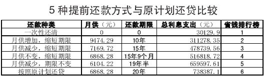 第五種,部分提前還款,增加月供,縮短還款期限。 提前還款10萬元,月供增加為9474.29元,還款期限縮短為10年,提前還款后總利息為311278.35元。 利息總額=30129.9+281148.45=311278.35元 業(yè)內(nèi)人士分析指出,縮短貸款期限是節(jié)省利息的關(guān)鍵因素。從上述計(jì)算結(jié)果來看,還款期限15年與10年相比總利息支出相差近16萬多元。而還款期限20年與10年相比更是多支付了高達(dá)42萬多元的利息,這筆費(fèi)用對(duì)于一個(gè)工薪家庭來講還是相當(dāng)可觀的。因此房貸消費(fèi)者一定要重視較長(zhǎng)的還貸年限所帶來的高額利息支出,根據(jù)自身經(jīng)濟(jì)情況盡量縮短還款年限,從而減少利息支出。 |