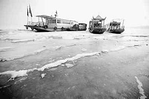 但從1月31日起,向陽(yáng)碼頭至蓮花碼頭幾公里寬的水域全面出現(xiàn)冰封,所有輪渡以及20多艘快艇都結(jié)結(jié)實(shí)實(shí)凍在冰里,水上交通因此中斷。