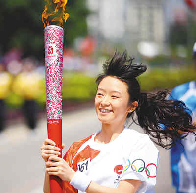 5月8日,奧運(yùn)火炬手傅瑜手持火炬?zhèn)鬟f。新華社記者 邢廣利攝 |