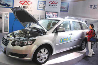 | 圖為北京環(huán)保節(jié)能車展上,奇瑞汽車公司推出的生物柴油新型能源動力汽車。博芽