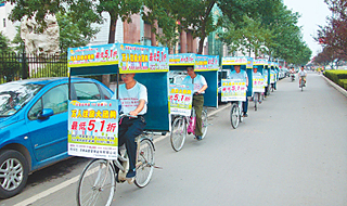 | 8月31日,濟(jì)南“萬人購房團(tuán)”發(fā)起人在泉城路開展廣告宣傳活動。本報記者