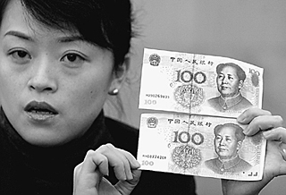 | 中國人民銀行專家詳解辨別人民幣假鈔(上為假鈔)。徐菲