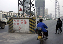 10月17日,在西安市朱宏路,一排電線桿“霸道”地分布在機動車道中央。