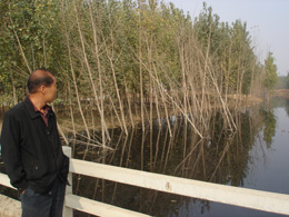 | 王建斌看著被污水泡死的樹木,黯然神傷。本報(bào)記者 李新民