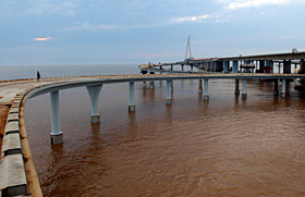 寧波港是我國國際集裝箱運(yùn)輸?shù)母删港,又是上海國際航運(yùn)中心的重要一員。根據(jù)國家規(guī)劃,上海國際航運(yùn)中心由洋山港與長江沿岸港口和寧波港三者組成,功能互補(bǔ),是上海國際航運(yùn)中心的“中心兩翼”。然而由于杭州灣的阻隔,寧波港與上海港、太倉港交通不便,不利于三港優(yōu)勢疊加和功能互補(bǔ)。 大橋建成后,杭州灣南岸的寧波、紹興和臺(tái)州等地到上海港、洋山港的距離均有不同程度縮短。寧波市港口局副局長孫時(shí)光表示,杭州灣跨海大橋的貫通,對(duì)寧波港口來講,既是機(jī)遇也是挑戰(zhàn)。孫時(shí)光認(rèn)為,從長遠(yuǎn)看,寧波港和上海港優(yōu)勢互補(bǔ)各呈所長,F(xiàn)寧波港有80多條國際航線,上海港有120多條國際航線。杭州灣大橋的貫通,環(huán)杭州灣及周邊地區(qū)的出口企業(yè),也有了更多的國際航線和更便捷運(yùn)輸路線的選擇余地。 據(jù)介紹,以往溫州、臺(tái)州一帶到上海的貨物,基本通過杭州線路運(yùn)達(dá)。杭州灣大橋建成后,每標(biāo)箱經(jīng)由杭州灣大橋要比走滬杭高速節(jié)省運(yùn)費(fèi)1500元左右。另一方面,蘇南和浙北地區(qū)的貨物流向也可能發(fā)生變化。杭州灣大橋建成后,蘇南到寧波北侖港的運(yùn)輸距離也相應(yīng)縮短了120公里,使這些地區(qū)的貨物進(jìn)出口增加了一個(gè)與上海港相類似的口岸。 而與大上海隔海相望的寧波港與舟山港,通過杭州灣跨海大橋與上海的蘆潮港相通,再通過上海東海大橋與大小洋山港相連,串起了中國長江出海口江海連運(yùn)“T”字型的黃金海岸。有數(shù)據(jù)顯示,2006年,上海港實(shí)現(xiàn)吞吐量4.7億噸、集裝箱2171萬標(biāo)箱;寧波-舟山港總吞吐量4.2億噸、集裝箱712萬標(biāo)箱。從港口吞吐量規(guī)模而言,上海港、寧波-舟山港已分別位居全球第一和第三的位置。據(jù)介紹,現(xiàn)舟山港-寧波港-杭州灣跨海大橋-蘆潮港-東海大橋-大小洋山港,已成為中國乃至世界上最大的港口群。而杭州灣跨海大橋則處在一線牽兩岸的關(guān)鍵環(huán)節(jié)。
