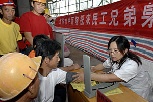 | 河南省焦作市醫(yī)護(hù)人員在為農(nóng)民工檢查身體。本報(bào)記者 王頌