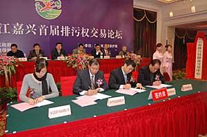 | 11月10日,國內(nèi)首個(gè)排污權(quán)交易平臺——嘉興市排污權(quán)儲備交易中心揭牌成立。成立當(dāng)天,共有15家當(dāng)?shù)仄髽I(yè)進(jìn)行了排污權(quán)交易。本報(bào)記者