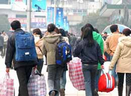 節(jié)前退保的農(nóng)民工紛紛背負行囊走上了回鄉(xiāng)之旅。 |