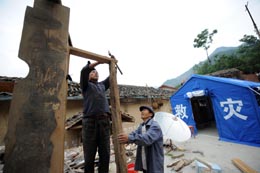 5月21日,隴南市武都區(qū)楓相鄉(xiāng)楓相塬村受災(zāi)群眾在用從廢墟中揀出來的木頭搭建防震棚。 地震發(fā)生后,甘肅省隴南市武都區(qū)受災(zāi)群眾在政府和社會(huì)各界的幫助下,積極展開生產(chǎn)自救,清掃廢墟,重建家園。新華社記者:聶建江