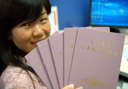 7月3日,國旅總社的工作人員向記者展示臺灣游首發(fā)團(tuán)游客的《大陸居民往來臺灣通行證》。目前大陸游客必須持有此證和相應(yīng)簽注才能前往臺灣旅游。 大陸居民赴臺旅游首發(fā)團(tuán)共有約760名團(tuán)員將于7月4日搭乘首航兩岸周末包機(jī),由北京、上海、南京、廈門、廣州五地陸續(xù)啟程。目前,相關(guān)旅游業(yè)者均表示已做好準(zhǔn)備。新華社記者:張舵