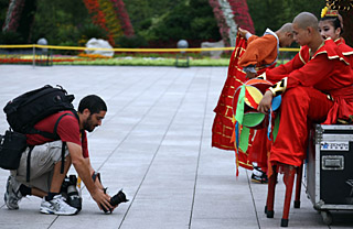 | 一名外國(guó)記者在天安門(mén)廣場(chǎng)采訪群眾文藝演出。新華社記者 高學(xué)余