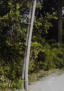 重慶市江津區(qū)李市鎮(zhèn)的一處簡陋陳舊的農(nóng)村電線桿,是用木棒捆綁而成,安全隱患嚴重。 |