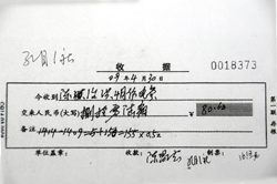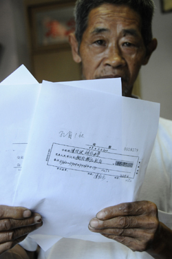 重慶江津區(qū)李市鎮(zhèn)孔目村一社的一名電費收費員,手持農(nóng)民的電費繳納單據(jù)。上面顯示著孔目村一社農(nóng)民陳治洪,2009年6月共用電7度,卻分攤了164度電的損耗,實際繳納電費88.9元,平均每度電12.7元。 |
