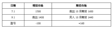 套期保值在現(xiàn)貨市場和期貨市場對同一種類的商品同時進行數(shù)量相等但方向相反的買賣活動,即在買進或賣出實貨的同時,在期貨市場上賣出或買進同等數(shù)量的期貨,經(jīng)過一段時間,當(dāng)價格變動使現(xiàn)貨買賣上出現(xiàn)的盈虧時,可由期貨交易上的虧盈得到抵消或彌補,這就是我們通常所說的風(fēng)險對沖。 我們以最簡單的例子來看一下套期保值的功能。假設(shè)某芝加哥的糧食貿(mào)易商在收獲季節(jié)采購小麥,7月1日從農(nóng)場主手中采購現(xiàn)貨,市場價格為1500元/噸,該貿(mào)易商為防止未來賣出時價格下跌,他同時在芝加哥期貨市場上賣出10月期貨合約做套期保值,價格為1600元/噸;到了9月1日時,現(xiàn)貨市場價格為1400元/噸,期貨市場上價格為1440元/噸,貿(mào)易商在這個時候平倉的話,將在現(xiàn)貨市場上每噸損失100元,而在期貨市場上每噸盈利160元,這樣現(xiàn)貨市場上價格下跌的風(fēng)險就由期貨市場上的盈利彌補了,貿(mào)易商還賺了60元。其盈虧收益如表所示: