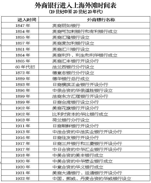 高樓大廈林立的上海外灘,是鴉片戰(zhàn)爭以來外資進入的一個縮影,在這塊彈丸之地上幾乎集中了上海所有的外資銀行,故而當時將外資銀行稱作“外灘銀行”。 外資銀行很早就進入了上海,與此相比,華資銀行的產生則整整晚了半個世紀。鴉片戰(zhàn)爭后,依據(jù)不平等的《中英南京條約》,上海等五個東南沿海城市被辟為通商口岸。上海開埠后的第四年即1847年,英商麗如銀行率先搶灘上海。在隨后的70多年中,以英國資本為主導,包括法國、德國、日本、俄國、美國等國資本在內的30余家銀行陸續(xù)在上海登陸(詳見外商銀行進入上海外灘時間表)。 這些銀行主要集中在從延安東路外灘到北京東路外灘,形成了上海的金融中心。各銀行為了顯示資本的雄厚,都在建筑外觀上追求各自獨特的風格,有哥特式、巴洛克式、羅馬式、中西合璧式等等。 由于外灘附近匯集了各國頗具實力的銀行,比如英國匯豐銀行、德國德華銀行、美國華旗銀行等,使外灘成為名副其實的“東方華爾街”。