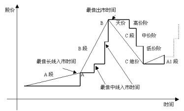 圖2-27A-B-C循環(huán)趨勢(shì)線 B趨勢(shì)線的橫坐標(biāo)記錄了B段經(jīng)歷的天數(shù),縱坐標(biāo)記錄了股價(jià)的變動(dòng),縱坐標(biāo)與橫坐標(biāo)之比記錄了股價(jià)上升的斜率。把經(jīng)歷B段天數(shù)的日成交量累加可計(jì)算出換手率和總成交量。通過(guò)軟件的特別功能,可計(jì)算出持股人數(shù)變化比。 C趨勢(shì)線的橫坐標(biāo)記錄了C段經(jīng)歷的天數(shù),縱坐標(biāo)記錄了股價(jià)的變動(dòng),縱坐標(biāo)與橫坐標(biāo)之比記錄了股價(jià)下降的斜率。把經(jīng)歷C段天數(shù)的日成交量累加可計(jì)算出換手率和總成交量。通過(guò)軟件可計(jì)算出持股人數(shù)變化比。 從入市風(fēng)險(xiǎn)來(lái)研究,A趨勢(shì)線的入市風(fēng)險(xiǎn)最小,B趨勢(shì)線次之,C趨勢(shì)線風(fēng)險(xiǎn)最大。 “風(fēng)險(xiǎn)入市法”規(guī)定,C趨勢(shì)線和B趨勢(shì)線的高價(jià)臺(tái)階是高風(fēng)險(xiǎn)時(shí)間段和高風(fēng)險(xiǎn)臺(tái)階,也是中長(zhǎng)線投資者禁止入市的時(shí)間段和臺(tái)階。 A-B-C循環(huán)趨勢(shì)線能提供給投資者最佳的入市時(shí)間。入市的最佳時(shí)間是B趨勢(shì)線的起始點(diǎn)的前后幾個(gè)交易日;A-B-C循環(huán)趨勢(shì)線給出了最佳出市時(shí)間,出市的最佳時(shí)間是C趨勢(shì)線起始點(diǎn)前后幾個(gè)交易日。 如圖2-28所示,A-B-C循環(huán)趨勢(shì)線加上每一段的臺(tái)階式走勢(shì)可以告訴您當(dāng)前股票在哪一段或哪一個(gè)臺(tái)階上運(yùn)行的精確位置,并借助計(jì)算機(jī)的幫助,可以知道未來(lái)股市的準(zhǔn)確走勢(shì)。 這種兩級(jí)劃分方法使股價(jià)走勢(shì)圖形更加清晰、清楚。絕大部分投資者所關(guān)心的是股市當(dāng)天和未來(lái)的走勢(shì)。所以,對(duì)當(dāng)前和未來(lái)的走勢(shì)要細(xì)分,而對(duì)過(guò)去的走勢(shì)可粗分。 圖2-28清楚地告訴投資者當(dāng)前股票處在走勢(shì)中的準(zhǔn)確位置,準(zhǔn)確地告訴投資者最佳入市段、入市階、最佳出市段和出市階。 圖2-28A-B-C循環(huán)趨勢(shì)線和各段臺(tái)階式走勢(shì)示意圖 A-B-C循環(huán)趨勢(shì)線為計(jì)算機(jī)提供準(zhǔn)確的數(shù)據(jù)取樣點(diǎn)和時(shí)間周期。通過(guò)對(duì)這個(gè)時(shí)間周期所定義的大量數(shù)據(jù)進(jìn)行分析、整理、比較和計(jì)算,可以準(zhǔn)確地了解到莊家和跟莊者的持股數(shù)量、操盤手法和A、B、C各段所發(fā)生的準(zhǔn)確時(shí)間以及持續(xù)的長(zhǎng)度,從而得到準(zhǔn)確的入市時(shí)間和出市時(shí)間。