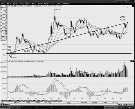 圖4深成指1991年-2006年的實(shí)際走勢(shì) 圖4深成指15年的走勢(shì)(1991-2006)
