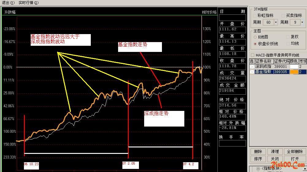 上圖是從去年2006年10月23日到2007年4月21日的基金指數(shù)和深成指的3TM彩虹走勢(shì)圖,黃色圖是基金走勢(shì),白色圖是深成指走勢(shì)。這是一個(gè)相對(duì)坐標(biāo)走勢(shì),以4月21日的價(jià)格為參考點(diǎn)。所以位于下面深成指走勢(shì)的升幅要大于位于上面基金指數(shù)的走勢(shì)。