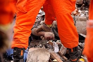 綿竹市漢旺鎮(zhèn),距離汶川地震震中直線距離約30公里,災(zāi)情十分嚴重,海軍陸戰(zhàn)隊2750多名官兵于16日凌晨4時趕到漢旺鎮(zhèn)后,立即展開救援行動。我得到消息后,馬上以最快的速度走出映秀鎮(zhèn),經(jīng)成都轉(zhuǎn)戰(zhàn)漢旺災(zāi)區(qū)。 17日下午,我終于趕到漢旺鎮(zhèn)東汽中學(xué)救援現(xiàn)場,陸戰(zhàn)隊官兵已經(jīng)在這里奮戰(zhàn)多時,一邊配合消防隊的救援挖掘機清理廢墟,一邊繼續(xù)尋找遇難學(xué)生的遺體。 在現(xiàn)場的陸戰(zhàn)隊員告訴我說,大地震造成漢旺東方汽輪機廠的東汽中學(xué)和東汽技校倒塌,中學(xué)受災(zāi)最為嚴重,至少有300多名中學(xué)生被埋在倒塌的瓦礫中。再就是漢旺煤礦的宿舍樓全部被毀,倒班休息的礦工們也沒有逃離厄運。 據(jù)資料顯示,漢旺曾是個美麗富饒的地方,是全國首批57個綜合改革試點鎮(zhèn)之一,全國500家小城鎮(zhèn)試點鎮(zhèn),全國生態(tài)環(huán)境及基礎(chǔ)設(shè)施建設(shè)試點鎮(zhèn),2001年榮獲全國創(chuàng)建文明城鎮(zhèn)示范點的光榮稱號。 可是,出現(xiàn)在我眼前的漢旺,卻是一片倒塌的廢墟,這里的人們已經(jīng)失去了自己美好的家園。漢旺鎮(zhèn)約有60余座高層建筑,強震后幾乎沒有一座建筑完好。據(jù)說,地震發(fā)生時,漢旺鎮(zhèn)政府的領(lǐng)導(dǎo)正在開會,一名副鎮(zhèn)長由于遲到了5分鐘,僥幸活了下來,其他班子成員全都被掩埋在鎮(zhèn)政府大樓的廢墟里。當時,東方汽輪機廠車間里有上千名工人在上班,地震時廠房倒塌也都被壓在廢墟里。 在東汽中學(xué),我目睹了救援人員尋找遇難學(xué)生遺體的悲壯場面。當一具具變形的遺體被從廢墟里抬出時,我明顯地感覺到現(xiàn)場的空氣在悲傷中凝固,令人窒息。盡管人們都戴著口罩,還是能夠聞到濃烈的氣味,非常難聞。 在漢旺鎮(zhèn)小學(xué)的操場上,擺放著幾十具剛剛挖出來的學(xué)生遺體,檢疫人員在進行逐一登記,家長們要在這里認領(lǐng)自己的孩子。這是個多么觸目驚心的場面!當家長們看到自己模糊不清的親生骨肉時,難以自禁地迸發(fā)出撕心裂肺的哭泣。面對此情此景,我淚流滿面,不忍心按下手中相機的快門。