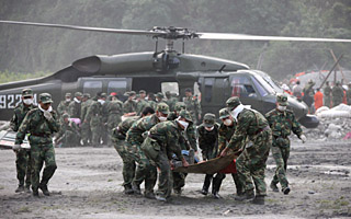 | 5月15日,解放軍救援部隊官兵在映秀鎮(zhèn)爭分奪秒搶救傷員。 | 5月12日,一個讓世界震驚的日子:中國四川省汶川縣發(fā)生8.0級特大地震。 災(zāi)情就是命令,時間就是生命。 職業(yè)的敏感告訴我,這是當今中國最大的突發(fā)性災(zāi)難事件,去抗災(zāi)一線,刻不容緩。 5月14日13時30分,運輸機降落在成都雙流國際機場。我隨著海軍醫(yī)療隊的車隊,馬不停蹄,連夜向地震中心的汶川進發(fā)。