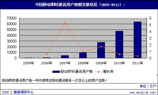3G到來(lái)后,網(wǎng)絡(luò)和終端的提升將極大地促進(jìn)無(wú)線增值業(yè)務(wù)以及無(wú)線互聯(lián)網(wǎng)的發(fā)展,移動(dòng)IM面臨著大好的發(fā)展時(shí)機(jī)。 其次,個(gè)人IM市場(chǎng)的持續(xù)飽和,促使騰訊QQ、msn也逐漸把重心轉(zhuǎn)移到移動(dòng)IM領(lǐng)域;根據(jù)賽迪顧問(wèn)的統(tǒng)計(jì)數(shù)據(jù),2007年中國(guó)個(gè)人IM市場(chǎng)注冊(cè)賬戶數(shù)達(dá)到8億,個(gè)人IM用戶數(shù)達(dá)到1.8億人,占互聯(lián)網(wǎng)總網(wǎng)民人數(shù)的92%.第三,隨著中國(guó)手機(jī)用戶的持續(xù)增長(zhǎng),并且各大服務(wù)提供商推出的IM產(chǎn)品及相關(guān)軟件,已經(jīng)獲得了相當(dāng)大部份用戶的肯定。魅媒調(diào)研中心發(fā)布的《中國(guó)移動(dòng)即時(shí)通訊用戶規(guī)模發(fā)展?fàn)顩r》數(shù)據(jù)中顯示,2007年移動(dòng)通訊用戶數(shù)量已達(dá)5000萬(wàn),到2008年達(dá)1億戶,預(yù)測(cè)還將持續(xù)增長(zhǎng)至2011年,用戶數(shù)可達(dá)4.75億。
