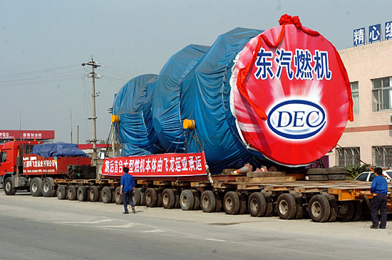 汶川大地震發(fā)生后,位于四川省綿竹市漢旺鎮(zhèn)工礦區(qū)的東方電氣集團東方汽輪機有限公司受損嚴重,直接經(jīng)濟損失50億元以上。東汽原計劃于5月12日由德陽運往樂山碼頭并將轉運福建莆田電廠的重型燃機因地震而滯留在成都市新津縣。6月3日,這臺燃機重新啟運。