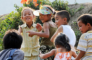| 6月5日,幾名映秀心連心學校的學生在放學路上嬉戲。目前,學校一共有學生17名,包括從幼兒園、小學到初中各年齡段的孩子。他們在這里除了正常學習外,更多的是接受心理輔導,以幫助他們樹立信心,走出災難的陰影。新華社記者