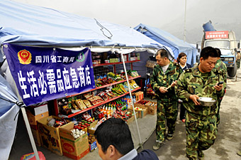“三聯(lián)購物”超市負責人楊波對記者說,他們這里的商品價格與震前沒有變化,電腦在震后就沒調整過價格。絕大部分商品都是庫存貨,有一些商品,如火腿腸、紅燒肉罐頭等出現(xiàn)斷貨。當?shù)匾恍┨峁┥唐返膹S家在地震中毀損嚴重,要進貨就得從成都進,但是有一些貨進價漲了,如塑料制品,進價漲了10%左右?蓙淼念櫩投际钱?shù)乩项櫩,或外地來的志愿者、援建者,所以不能漲價,不僅不能漲,還經常贈送一些東西給他們。 街頭一個經營小商品的婦女說:“我攤子的商品價格和地震前是一樣的,即使進貨價漲一點,我這里也不漲,大家都受災,將心比心。” 翔鳳橋社區(qū)受災群眾安置點愛心超市工作人員介紹,這里的商品都是從成都市新都區(qū)桂湖摩爾超市配送過來的,所有商品都是特價,基本上是該超市價格的90%,沒有利潤,如果算上運輸費用,是賠錢的,目的就是保證安置點里的受災群眾能買得起。這里的生活日用品價格比外面都要便宜一些,如嬌子牌香煙一盒11.5元,外面要賣12元;可口可樂一聽1.7元,外面賣2元;娃哈哈牌礦泉水一瓶1元,外面賣1.5元等。 每天到這個愛心超市購物的受災群眾有千人次左右,3名工作人員從早6時起忙到晚23時,每天營業(yè)額約有4000元左右!敖裉焱k姡娔X無法操作,如果是過去就停業(yè)了,但現(xiàn)在依然營業(yè),記不住的商品價格,就跟大家商量著來,總之不能讓受災群眾感到不方便!币幻ぷ魅藛T說。
