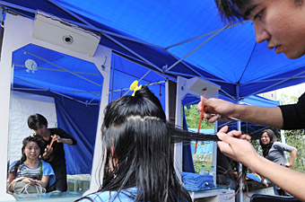 6月8日,一名理發(fā)師在為受災群眾修剪頭發(fā)。新華社記者 楊俊江