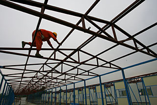 | 6月4日,一名工人在四川省什邡市洛水鎮(zhèn)搭建活動(dòng)板房。新華社發(fā)(鐘敏
