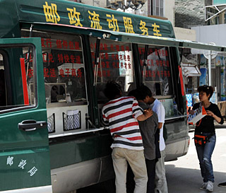 | 汶川街頭出現(xiàn)郵政流動(dòng)服務(wù)車(chē)。6月9日,人們?cè)诮诸^的郵政流動(dòng)服務(wù)車(chē)辦理郵政業(yè)務(wù)。新華社記者 唐召明