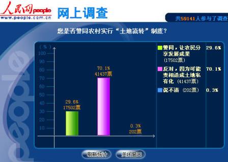 30年改革開(kāi)放帶來(lái)農(nóng)村巨變。十七屆三中全會(huì)召開(kāi),審議通過(guò)了《中共中央關(guān)于推進(jìn)農(nóng)村改革發(fā)展若干重大問(wèn)題的決定》,標(biāo)志著我國(guó)農(nóng)村改革站在一個(gè)新的歷史起點(diǎn)上。其中“土地流轉(zhuǎn)”因?yàn)楸粡V泛關(guān)注和熱議,已經(jīng)成為包括網(wǎng)絡(luò)在內(nèi)的各種媒體的流行詞。中國(guó)共產(chǎn)黨新聞網(wǎng)針對(duì)“土地流轉(zhuǎn)”推出網(wǎng)上調(diào)查《您是否贊同在我國(guó)農(nóng)村實(shí)行“土地流轉(zhuǎn)”制度?》,截止到10月20日9:00,共有59141人參與調(diào)查,網(wǎng)友留言278條。