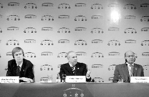 | 9日,在巴西圣保羅,巴西財(cái)政部長(zhǎng)曼特加(中)、英國(guó)財(cái)政部秘書蒂姆斯(左)、南非財(cái)政部長(zhǎng)曼紐爾出席新聞發(fā)布會(huì)。新華社圖 | 二十國(guó)集團(tuán)(G20)財(cái)政部長(zhǎng)和中央銀行行長(zhǎng)2008年年會(huì)9日在巴西圣保羅閉幕。代表們?cè)跒槠趦商斓拈]門會(huì)議中就金融危機(jī)產(chǎn)生的原因及應(yīng)對(duì)措施進(jìn)行了深入探討,并為本月中旬在華盛頓舉行的G20金融峰會(huì)奠定共識(shí)基礎(chǔ)。中國(guó)政府出臺(tái)的十項(xiàng)擴(kuò)大國(guó)內(nèi)需求的措施引起廣泛關(guān)注,年會(huì)輪值主席國(guó)代表、巴西財(cái)長(zhǎng)曼特加稱贊中國(guó)應(yīng)對(duì)危機(jī)“走在了前頭”。與此同時(shí),與會(huì)代表紛紛表示將采取激勵(lì)性財(cái)稅政策,以應(yīng)對(duì)金融危機(jī),避免經(jīng)濟(jì)衰退。