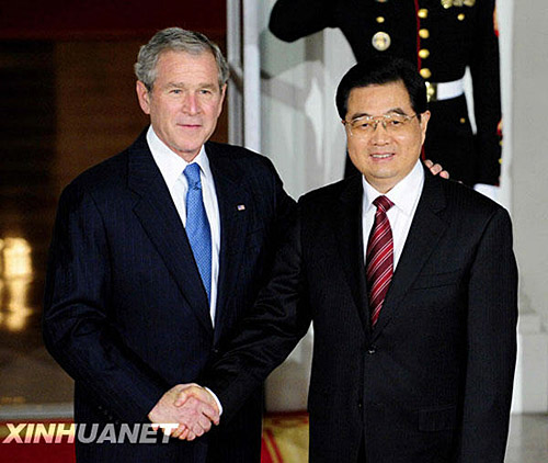 11月14日,美國總統(tǒng)布什在白宮為出席二十國集團(tuán)領(lǐng)導(dǎo)人金融市場和世界經(jīng)濟(jì)峰會的領(lǐng)導(dǎo)人舉行招待晚宴。這是晚宴前,美國總統(tǒng)布什在白宮迎接中國國家主席胡錦濤。新華社記者