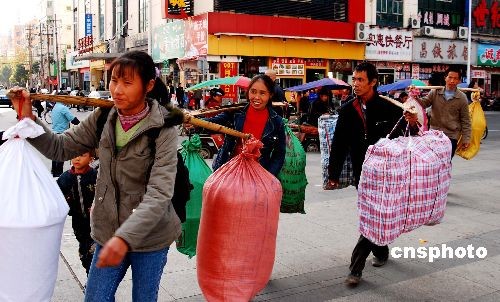 11月20日,大批農(nóng)民工拖著行李涌出江西南昌火車站。受金融風(fēng)暴的影響,江西南昌提前出現(xiàn)農(nóng)民工返鄉(xiāng)高潮。自10月底開始農(nóng)民工就陸續(xù)提著大包小包從廣州、深圳、東莞等地返回江西南昌、九江等地區(qū)。