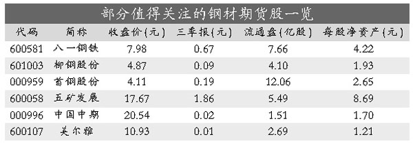 鋼鐵上市公司將最為受益。期貨市場(chǎng)的套期保值和價(jià)格發(fā)現(xiàn)功能,將給鋼鐵上市公司提供良好的規(guī)避風(fēng)險(xiǎn)工具。去年4季度鋼鐵價(jià)格暴跌,使整個(gè)鋼鐵行業(yè)陷入虧損,目前上市鋼企發(fā)布的業(yè)績(jī)快報(bào)較前期也可算是慘不忍睹。前期大盤暴漲中,鋼鐵板塊漲幅較小,存在補(bǔ)漲的可能,投資者可關(guān)注股本較小、股價(jià)較低的優(yōu)質(zhì)鋼鐵股。