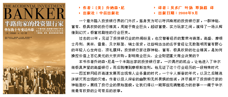 漫長(zhǎng)的道別 吸引我加入投資銀行的理由是,我將有能力影響決策者,認(rèn)識(shí)到這一點(diǎn),我甚至懷疑是否會(huì)后悔離開(kāi)這里。不管行業(yè)整體還是我個(gè)人的情況如何糟糕,我仍然應(yīng)該想想是否還有其他的選擇。是不是有這樣的職位,既可以同樣接觸到?jīng)Q策者,又可以不受制于大機(jī)構(gòu)的繁雜限制?我不知道答案,但我知道這已經(jīng)無(wú)關(guān)緊要。不管我如何喜歡投行世界的這些方面,它在我值得為之努力的全部事業(yè)中已變得微不足道。我開(kāi)始意識(shí)到前面提到的行業(yè)變化已經(jīng)沖淡了投行所提供的服務(wù)價(jià)值。